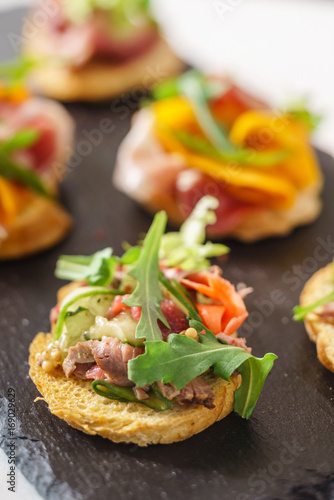 canape, christmas, dinner, snack, food, catering, bread, fish, salmon, cream cheese, vegetable, meat, beef, toast, tray