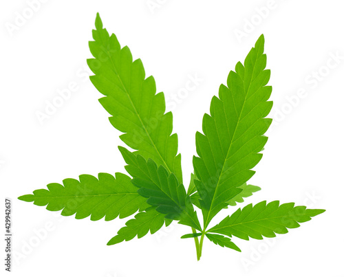 Cannabis leaves isolated on white background. Hemp leaf close up. Marijuana green leaf.