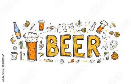 Canned beer, bottles of beer, and mugs with foam icons in a doodle style, beer elements. a bottle and can with the label "BEER," and a mug of foam