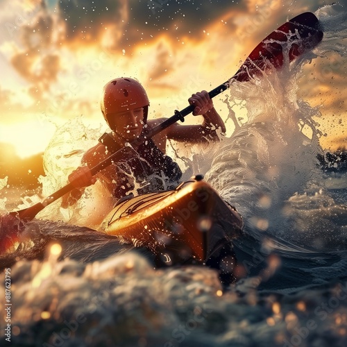Canoeist navigating through turbulent waters and gates with splashes around I’m warm light
