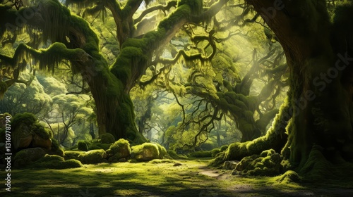 canopy, oak, tree, moss, illustration, forest, sunlight, serene, dappled, magical, atmosphere, lush, green, carpet, nature, calmness, timberland, ecosystem, foliage, verdant, peaceful, landscape, natural, environment, growth, beauty, shade, texture, organic, habitat, flora, scenery