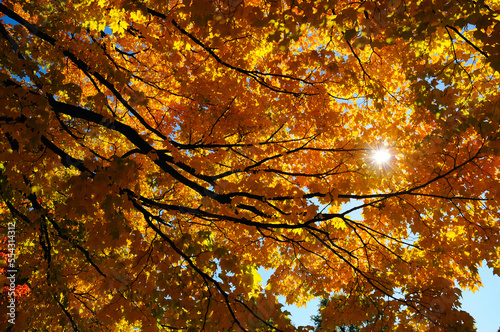 Canopy view of a maple tree, Acer species, with fall foliage.; Arlington, Massachusetts.