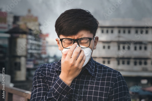 Can't breathe. Man wearing the respiratory protection mask against air pollution and dust particles exceed the safety limits. Healthcare, environmental, ecology concept. Allergy, headache.