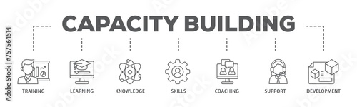 Capacity building banner web icon illustration concept with icon of training, learning, knowledge, skills, coaching, support, and development icon live stroke and easy to edit