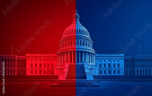 capitol, us, america, election, candidate, rally, symbolism, leadership, illustration, red, blue, political, division, contrast, government, politic, cleaving, balance, power, congress, democracy, night, patriotism, building, architecture, symmetry, polarization, party, national, capital, landmark, vibrant, symbolic, iconic, federal, representation, skyline, night view