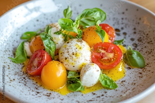 Caprese salad featuring cherry tomatoes in yellow green and red mozzarella balls and fresh basil on a white plate