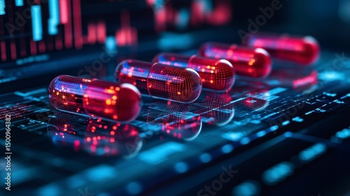 capsule, red, blue, electronic, datum, technology, digital, pharmaceutical, medicine, science, health, health care, research, innovation, futuristic, modern, abstract, surface, pill, medication, treatment, pharmacy, diagnostic, analysis, development, laboratory, display, light, computing, medicals, equipment, design, pattern, structure, composition, closeup, vibrant, bright, detail, perspective, sharpened, artificial, network, dot, connection, code, complex, information