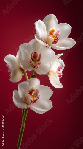 Captivating close-up of stunning white orchids, showcasing their beauty against a rich red backdrop.