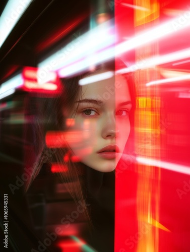 portrait, woman, underground, station, fashion, motion, blurred, background, caucasian, white, european, black, red, abstract, modern, urban, beauty, dynamic, individual, striking, contemporary, vibrant, city, vibe, long, hair, glasses, mood, eye contact, creative, scene, aesthetic, contrast, style, character, unique, lifestyle, representation, female, human, person, photo, picture, image, adult, grown-up, vertical