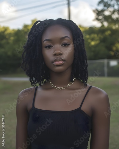 Captivating portrait of a young woman with natural hair in a sunlit outdoor setting during late afternoon