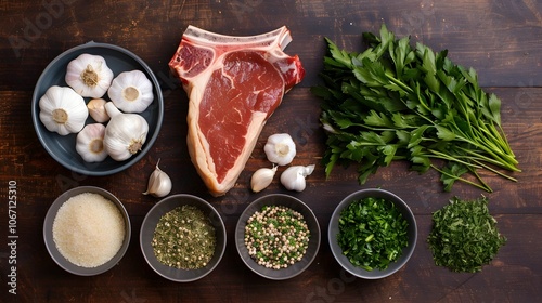 Captivating still life of a juicy raw T bone steak placed on a rustic wooden butcher s block surrounded by aromatic fresh herbs whole garlic cloves and an assortment of seasoning