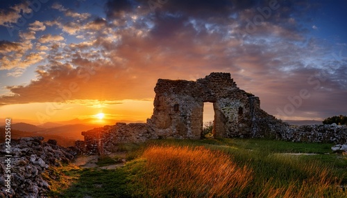 captivating sun setting behind a weathered facade of a mystical ruin bathed in golden hour glow and dramatic sky