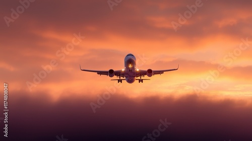 Captivating Sunset Flight: Airplane Ascending into Colorful Skies