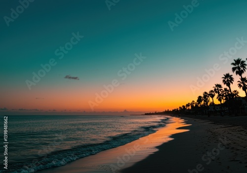 Captivating sunset over the ocean, palm trees lining a pristine beach with orange and teal hues.