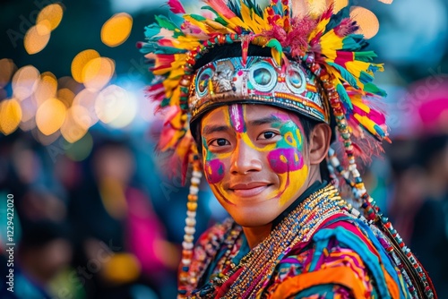 Captivating Tatung performer at Cap Go Meh Festival in traditional attire with vibrant face paint, colorful accessories, and a blurred crowd in the background
