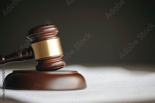 capture close-up image of gavel resting on financial document illuminated by soft light with ample copy space surrounding