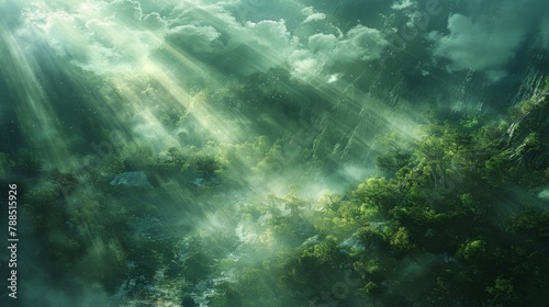 Capture the essence of a birds-eye view of an otherworldly landscape bathed in mystical light Use digital rendering techniques to enhance the magical aura, perfect for creating a sense of mystery and