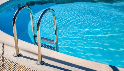 Captures the inviting and refreshing look of a clean swimming pool with a stainless steel ladder, perfect for a summer day.