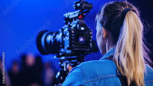filmmaker, camera, directing, blue, creative, woman, professional, equipment, production, sharpened, artistic, event, technology, media, cinematography, portrait, hair, ponytail, background, light, action, scene, storytelling, innovation, capture, lens, studio, performance, atmosphere, visual, motion, art, life events, passion, skill, talent