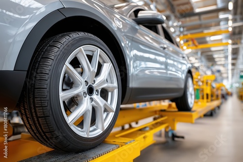 Car Assembly Line with Focus on Silver Vehicle Tire and Modern Manufacturing Equipment