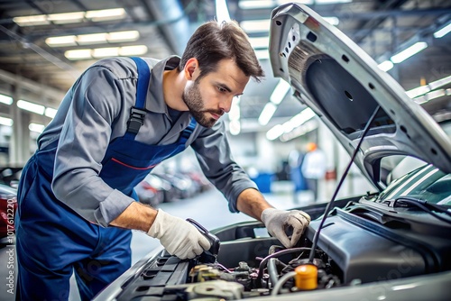Car care and service A technician is troubleshooting an engine. Spare parts of car engines that have problems and support car insurance services, standard car repair service center concepts.