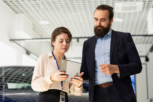 Car dealership saleswoman showing product offerings on tablet to client, making appropriate recommendations. Showroom agent presents financing options to customer on device
