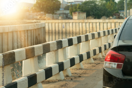 Car drive on the road in evening beside river with wall to protect.