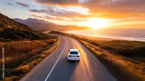 Car driving along a scenic coastal road at sunset during a summer road trip