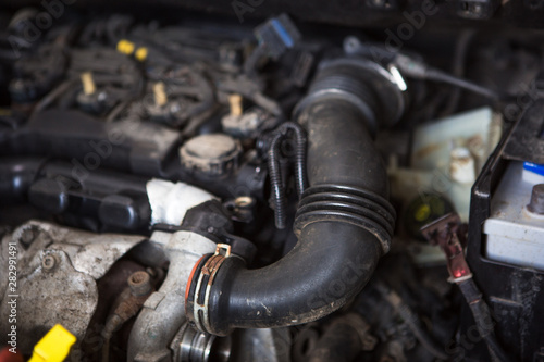 Car engine disassembled separately from the machine. The process of repairing the engine in the service station.