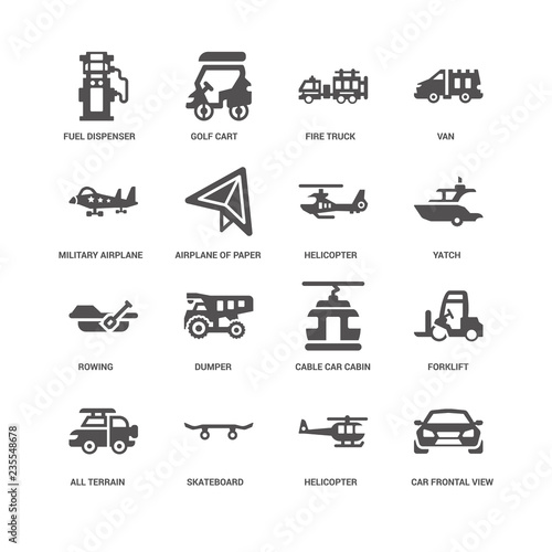set, icon, vector, car, front, helicopter, transport, vehicle, skateboard, skate, skateboarding, terrain, forklift, lift, warehouse, cable, ski, dump truck, truck, construction, rowing, boat, paddle, yatch, water, travel, transportation, air, paper, aeroplane, aircraft, plane, van, delivery, shipping, fire engine, fire, station, golf cart, golf, cart, fuel, 16