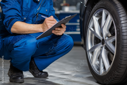 car, maintenance, service, repair, auto mechanic, mechanic, tire, inspection, wheel, clipboard, uniform, workshop, garage, vehicle, professional, safety, checking, hand, kneeling, industrial, equipment, transport, transportation, closeup, detail, routine, diagnosis, technician, background, indoor, clean, modern, workplace, automotive