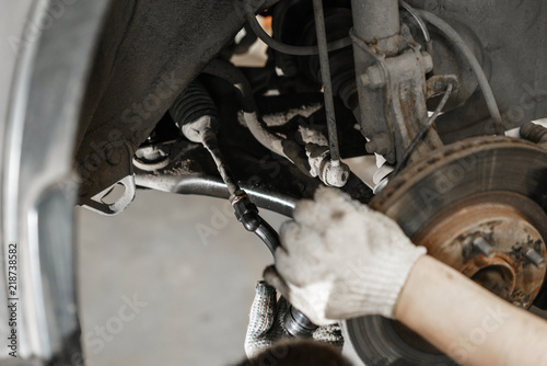 Car mechanic inspecting car wheel and repair suspension detail. Lifted automobile at repair service station. replacement of ferrule and leverage