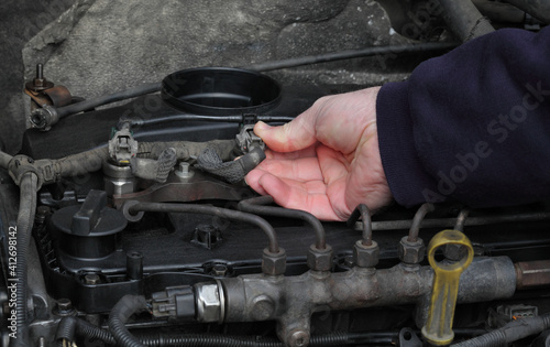 Car mechanic worker fixing modern common rail diesel engine, closeup of hand placing electrical connector to injector