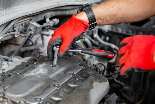 Car repairs. An auto mechanic unscrews the gas distribution mechanism cover with a ratchet wrench