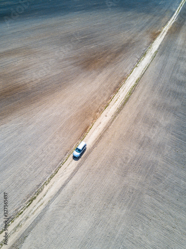 Car road between plowed fields, aerial view.
