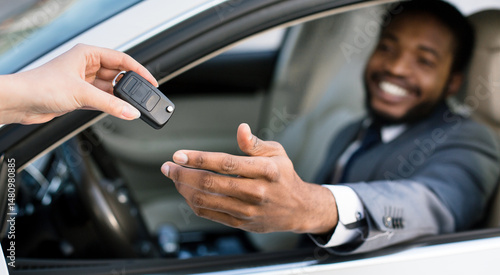 hold, salesman, gift, rent, give, hand, photogenic, new, key, person, manager, vehicle, dealer, car, young, luxury, sale, cheerful, closeup, auto, lock, woman, people, client, smiling, business, african american, rental, transport, man, client, trade, black, panorama, automobile, owner, selling, dealership, beard, showroom, buy, salesperson, agent, work, purchasing, leasing