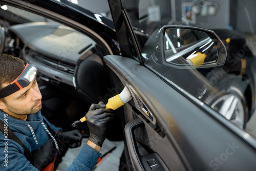 Car service worker in uniform provides a professional vehicle interior cleaning, wiping door panel with a brush at the car service station