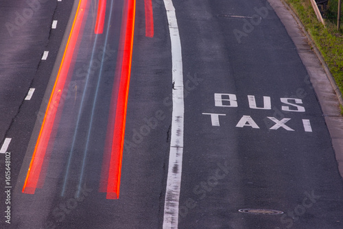 Car speeding on a highway with motion blur with separated bus and taxi lane on the right