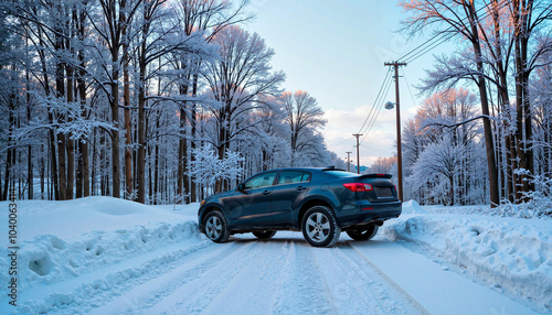Car stuck in snow on winter road, risks of driving in icy conditions