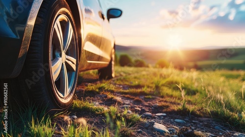 car, tire, wheel, rim, sunset, landscape, sky, cloud, sun, field, grass, green, nature, gold, light, ray, horizon, travel, road, adventure, outdoors, drive, journey, summer, warm, scenic, beautiful, blur, closeup, detail, bright, vibrant, background, picturesque, photo, photo