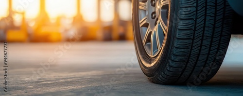 car tire illuminated by sunset, showcasing the detailed tread pattern and sleek design against a blurred background.
