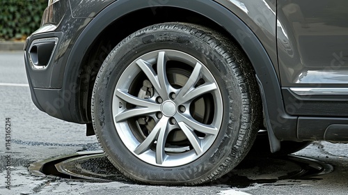 city, street, wet, water, urban, metal, grey, depth, asphalt, transportation, dark, surface, black, outside, repair, maintenance, exterior, car, road, vehicle, ground, broken, accident, tire, wheel, alloy, damage, pothole, automobile, suv, rim, driving, hazard, danger, hole, sinkhole, fractured, muddy, puncture, problem, impact, fluid