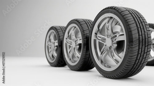 Car wheels, or tires, made of aluminum are displayed on a white background.