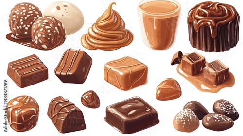 Caramel candies and caramel sauce isolated on a white background for food-related product designs.