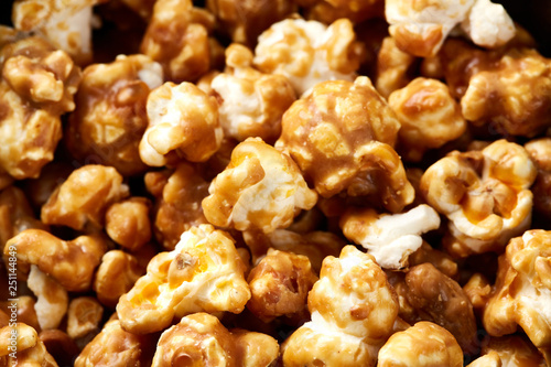caramel pop corn background. Golden caramel popcorn close up. Background of popcorn. Snacks and food for a movie