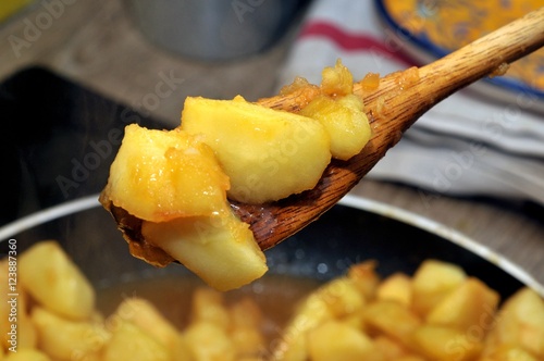 apple, caramel, cooking, wooden spoon
