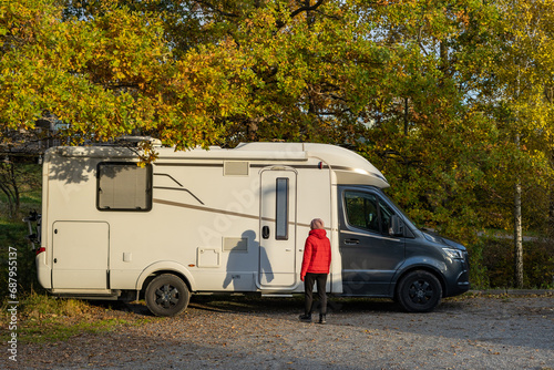 Caravan travel trailer RV motor home camper. Car vehicle journey. Tourism Summer vacation holidays activity trip to Europe. A woman gets into a car for travelling. House on wheels concept.