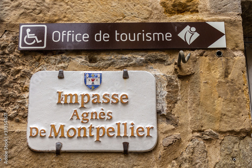 Carcassonne / France - March 15, 2020: Carcassonne Cité street sign Impasse Agnes de Montpellier Street and Tourism Office direction sign.