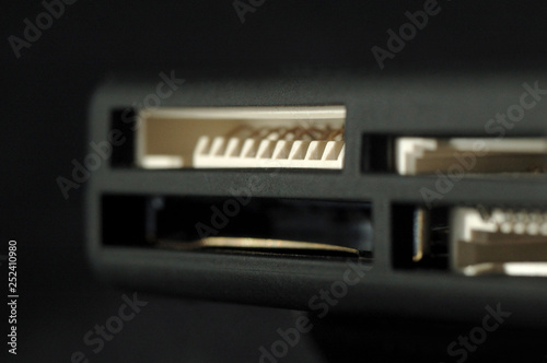 Card reader. Ports for various memory card formats closeup. Shallow depth of field