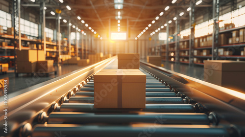 Cardboard box moving along a conveyor belt in a well-organized warehouse, bathed in warm sunset light filtering through windows